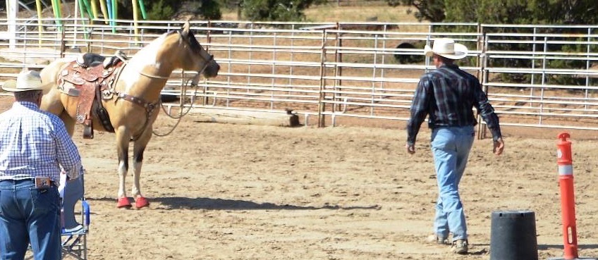 When I really want to work on the ground tie I like to use a 20 ‘ lead rope with a thin rope halter so that I can walk away from the horse and check the lead, using a quick tug and release, if the horse moves towards me. When I don’t want a horse to walk towards me I check the lead line with my left hand while I raise my right hand above my head as a signal to stand still. I use the word whoa when I check the line so when I don’t have a lead line they will hear me and stop.